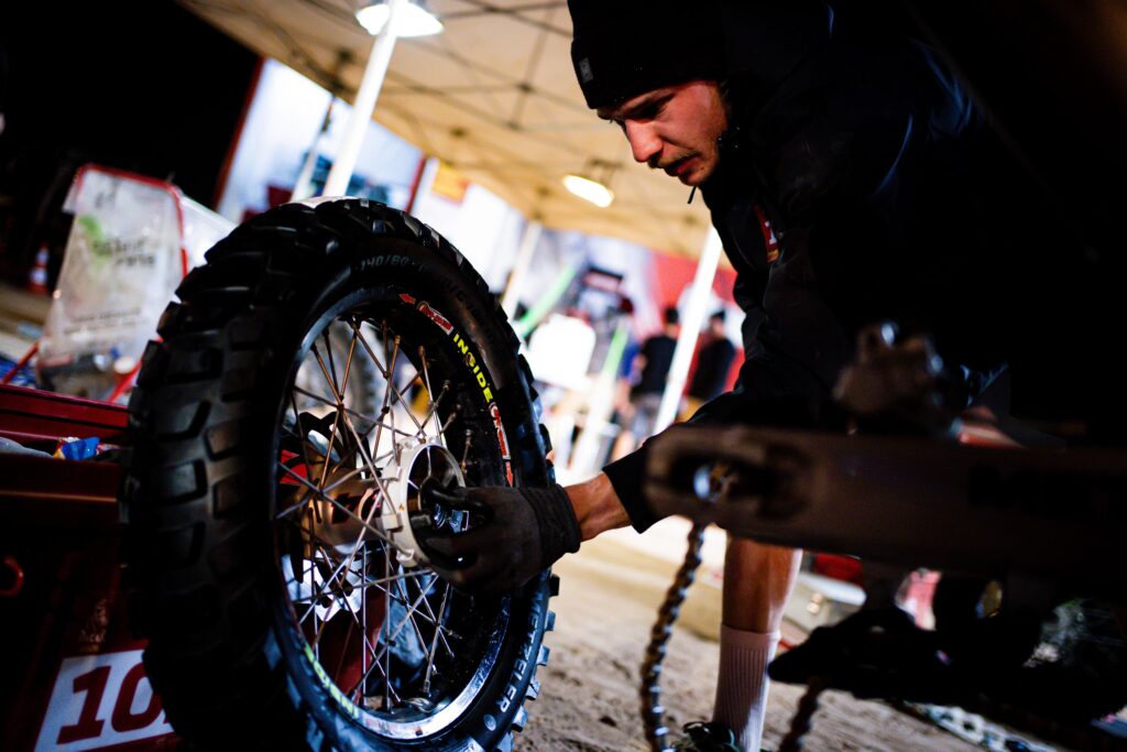 Reifen sind bei der Dakar Mangelware. Maxi hat davon keinen Überfluss dabei. Jeder einzelne ist markiert, jede Entscheidung wohlüberlegt. Frische Reifen gab es gezielt vor der Marathon-Etappe – danach heißt es: haushalten, planen, vorausdenken.